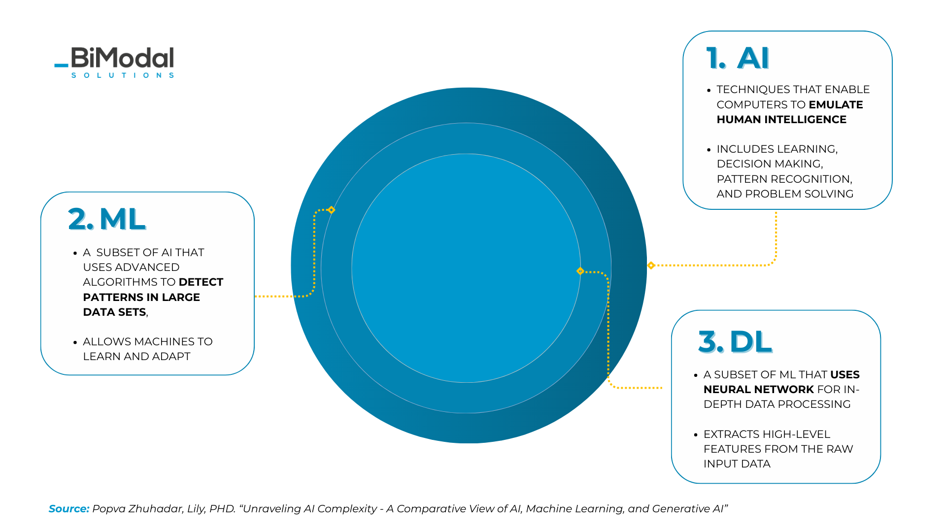 The objective of this article is to provide a clear definition of the fundamental concepts related to artificial intelligence and to illustrate its application in a business context. It provides answers to some key questions about AI and ML, defined as tools that we, as developers of Bimodal Solutions, use to meet business needs. We will also indicate the differences between the scientific fields dealing with AI algorithms to make our customers aware of the extent of our solutions' capabilities.