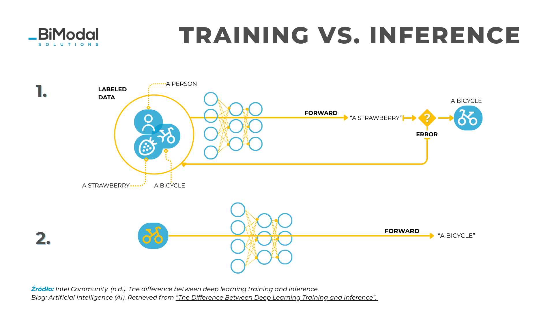 The terms "training" and "inference" in the context of ML and AI may sound a bit technical. However, both processes are based on a straightforward logic: first, software developers teach the model, and later on, they allow it to utilize the gathered knowledge.